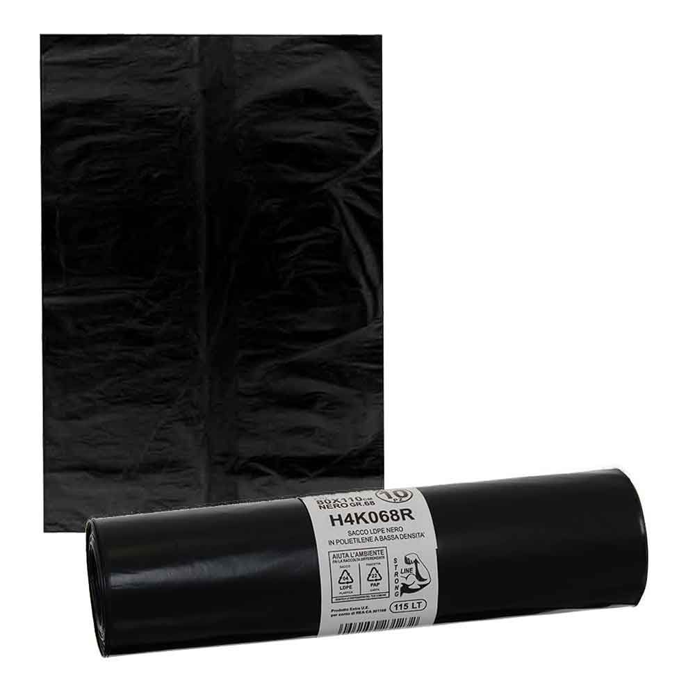 - Sacchi spazzatura prodotti in LDPE polietilene a bassa densità, colore nero, ideali per rifiuti ingombranti e raccolta indifferenziato. Spessore 42 my, 68 gr, capacità 115 litri.