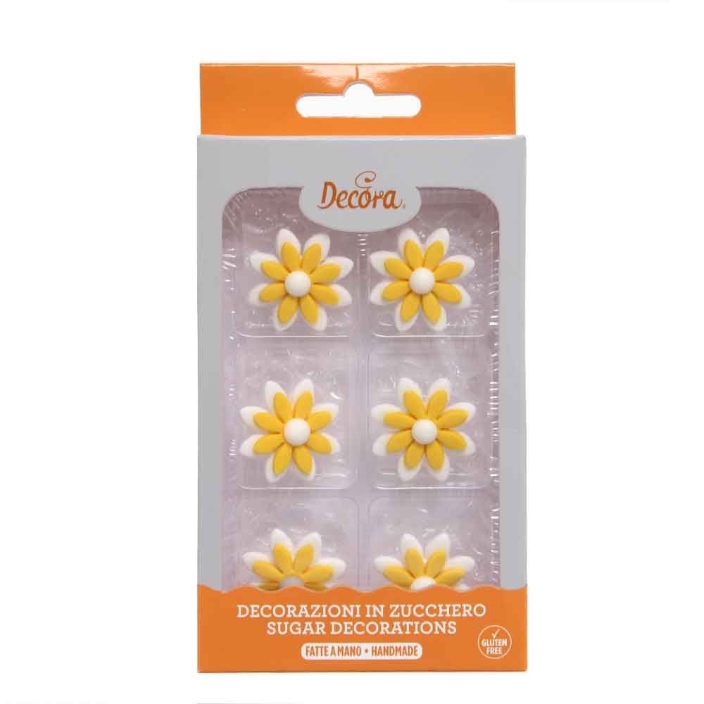 • 6 decorazioni di zucchero margherite bicolore gialle e bianche Decora. Fiori per torte di zucchero eleganti e sfiziosi da applicare su dolci, muffin e cupcake.