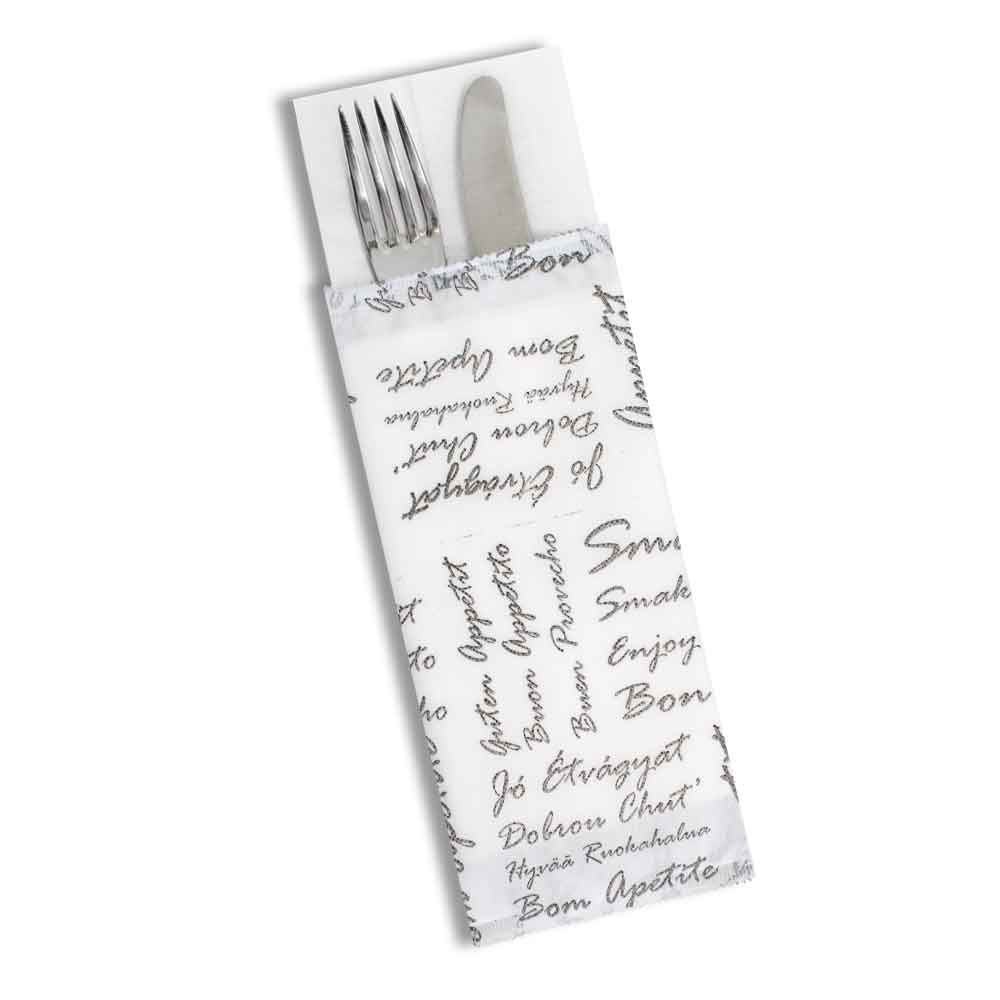 - Confezione da 50 buste portaposate in TNT bianco fantasia Idiomas con tovagliolo usa e getta in vendita al MIGLIOR PREZZO GARANTITO!
