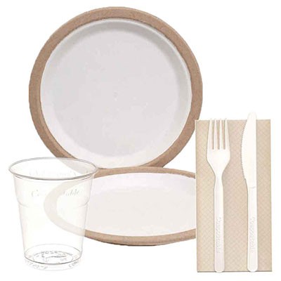 Parliamo ora di alcuni fra i più comuni materiali usati per realizzare stoviglie compostabili:- PLA ovvero biopolimeri, e cioè sostanze di origine vegetale che si estraggono a partire da barbabietola da zucchero, canna da zucchero, mais e manioca. Le sostanze vegetali vengono sottoposte ad un processo chimico che consente di ottenere bicchieri e posate che all'apparenza sembrano di plastica ma che sono al 100% compostabili, e che alla fine della loro vita non costituiranno uno scarto inquinante ma andranno a creare compost che sarà utile per arricchire il terreno dove nasceranno altre piante, creando un ciclo rinnovabile e sostenibile. I bicchieri compostabili in PLA, le monoporzioni compostabili e gli altri prodotti realizzati in questo materiale sono belli e trasparenti ma va detto che hanno una bassa resistenza alle alte temperature: possono resistere infatti a non oltre 40°C e quindi non possono essere usati per contenere bevande e cibi molto caldi. Alcuni bicchieri compostabili realizzati in PLA di ultima generazione possono sopportare fino a +70°C, consentendone l'uso anche con bevande calde ma non bollenti.
