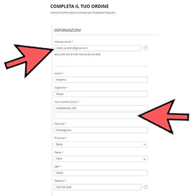- Dati per la spedizione: Si aprirà dunque un'altra schermata dove inserire i dati: per primi inseriamo i dati utili alla spedizione, quindi nome, cognome e indirizzo che andranno stampati sul pacco. Importante inserire un cellulare corretto dove poter essere contattati dal corriere in caso di problemi di consegna. nel caso di consegna presso aziende o attività commerciali è sempre bene indicare il nome che il corriere troverà scritto sull'insegna, in modo da evitare errori e ritardi nella consegna del pacco.