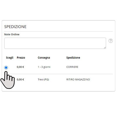- Spedizione con corriere: Nella sezione dedicata alla spedizione viene automaticamente selezionata la spedizione con corriere espresso, con consegna a domicilio da 1 a 3 giorni lavorativi. Nel caso in cui invece intendete venire di persona a ritirare il pacco presso il nostro magazzino e non riceverlo tramite corriere, dovrete selezionare "Ritiro magazzino". Per questo potete leggere la guida passo passo su come ritirare un ordine presso il nostro magazzino cliccando quì.