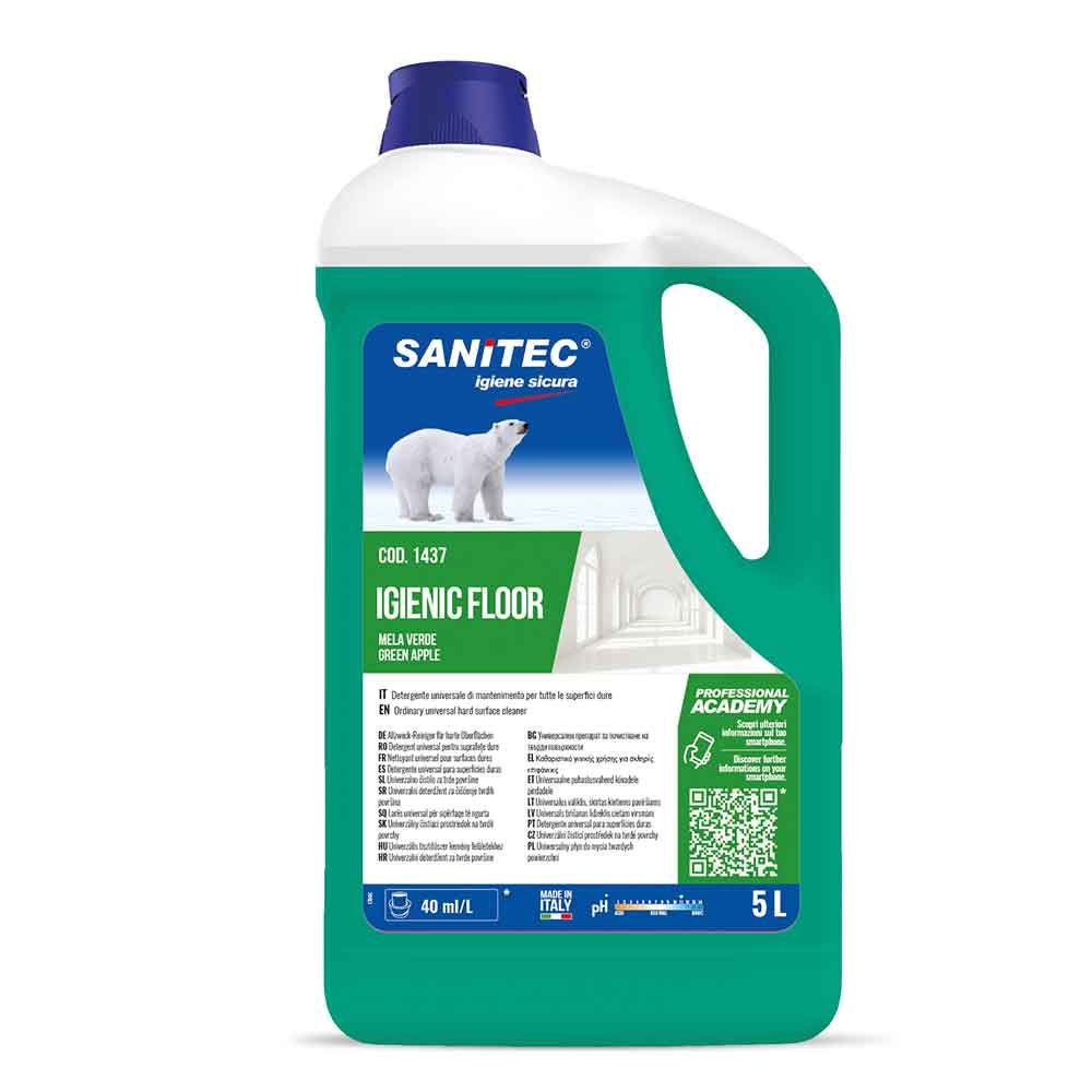 - Detergente pavimenti Igienic Floor Sanitec 5 L. Detergente profumato alla mela verde per la pulizia di pavimenti e superfici dure.