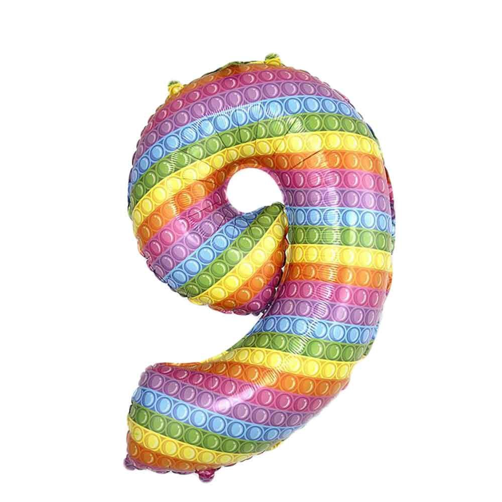 - Palloncino in mylar numero 9 multicolore Pop it grande 33″ 85 cm per feste e compleanni. Palloncino a forma di numero 9 gonfiabile ad aria e elio per addobbi e composizioni.